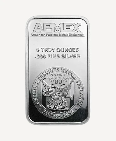 These APMEX 5 oz Silver bars have a deep-mirror, proof-like finish and are guaranteed.999 fine. The timeless American eagle design serves as a stunning complement to the Precious Metal content.